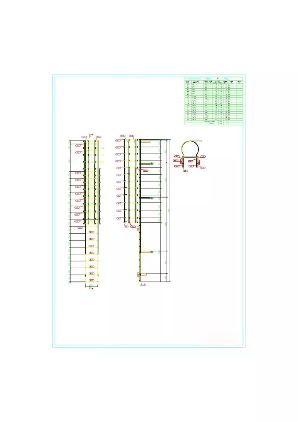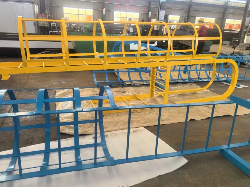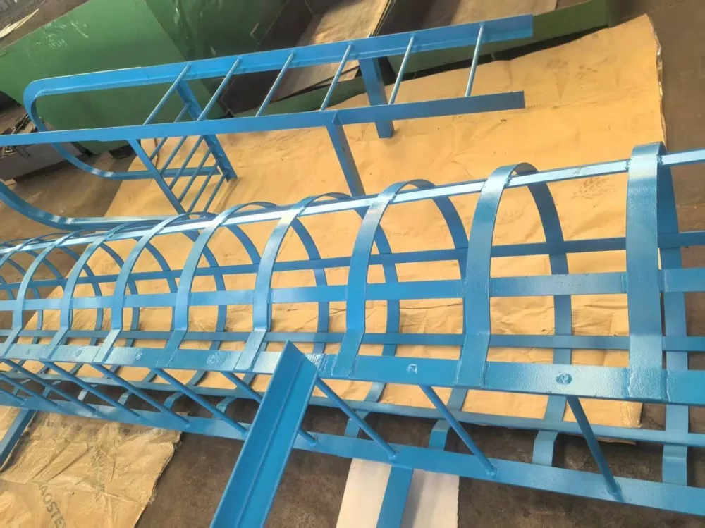 Installation de garde-corps : Pour les marches dépassant 3 mètres de hauteur, les garde-corps doivent être installés à 2,5 mètres du sol. Le diamètre du garde-corps doit être compris entre 700 mm et 800 mm. Les anneaux horizontaux doivent être en acier rond de 16 mm, avec une distance entre les anneaux de 300 mm à 450 mm. Les barres de renfort verticales doivent être en acier rond de 12 mm, avec au moins quatre barres uniformément espacées. L'armature de sécurité doit être installée en continu jusqu'au sommet de l'échelle ou de la plateforme de repos. Connecteurs et fixations